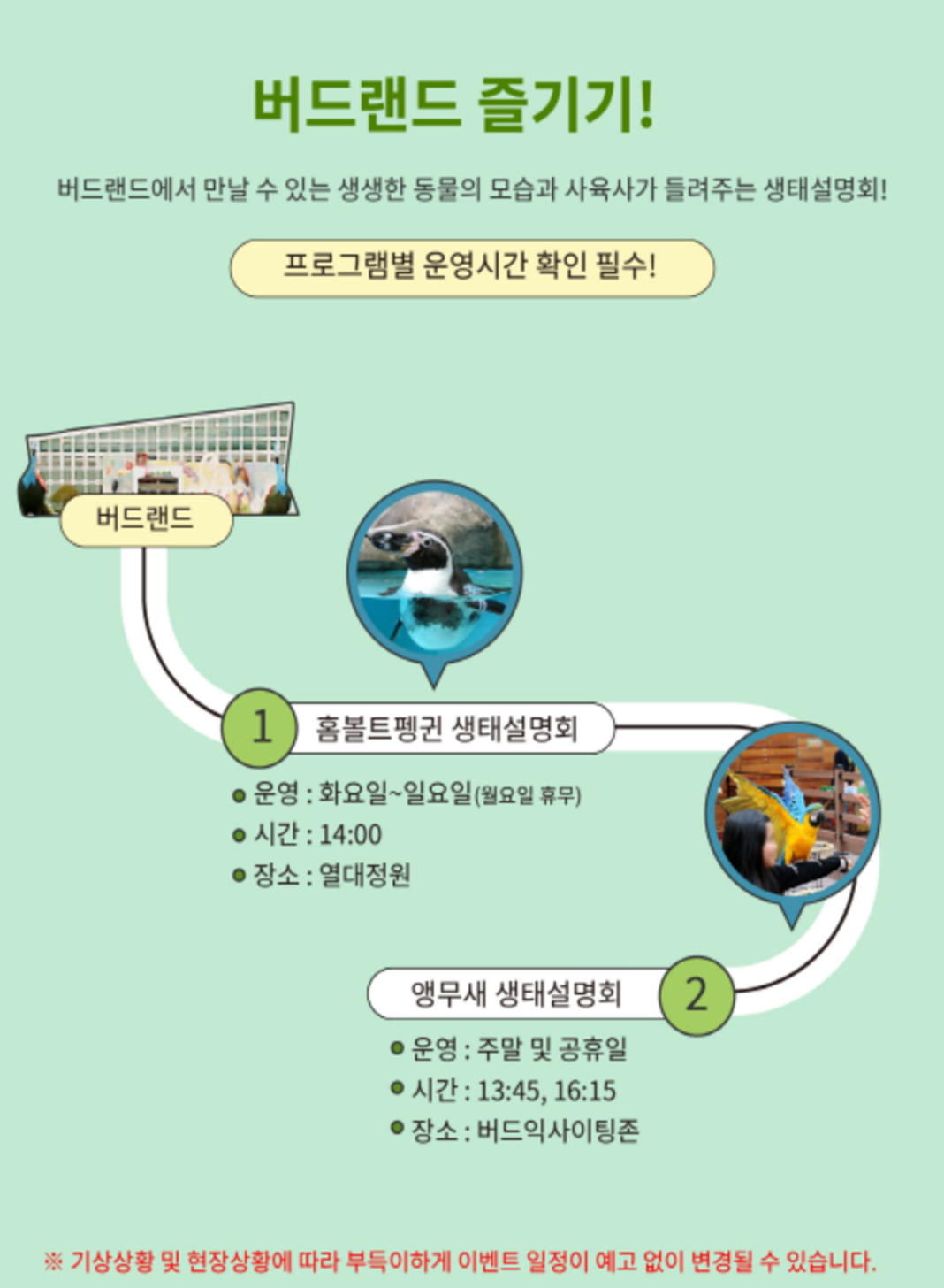 | 생태설명회(주랜드) | 화~일 | 13:50~15:30 | 동물별 시간 주의 |