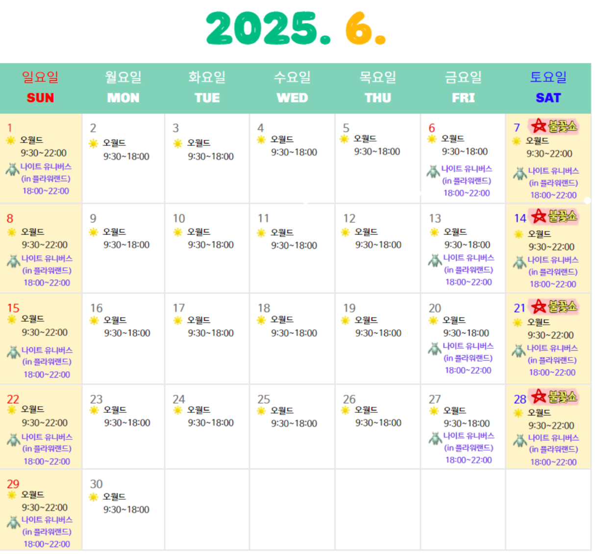 | 나이트 유니버스 | 금·토·일 | 18:00~22:00 | 플라워랜드 전용 |