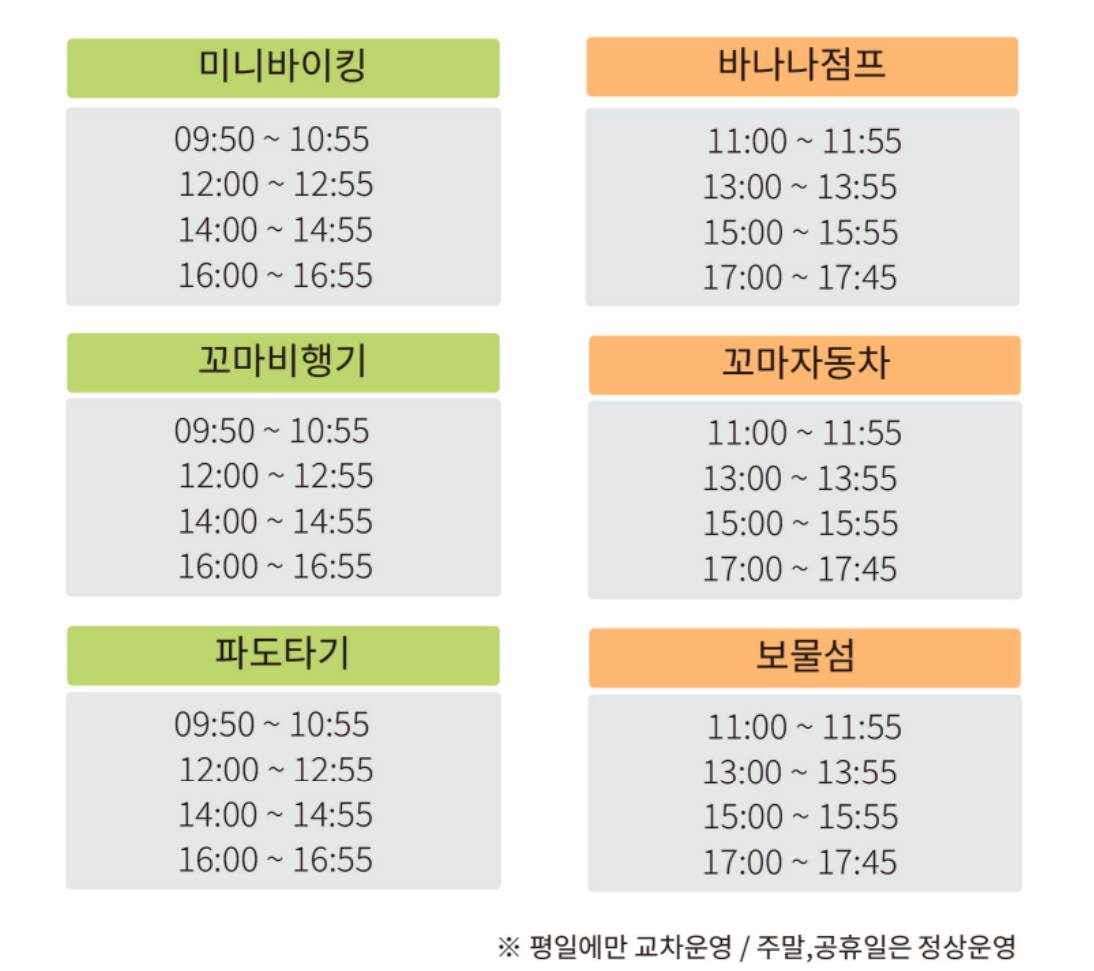 | 조이랜드(놀이기구) | 9:50 ~ 17:45 | 9:50 ~ 21:45 |