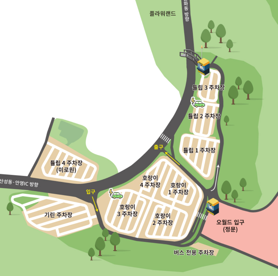| 장소 | 놀이기구, 동물원, 사파리, 플라워랜드 전체 | 플라워랜드 한정 |