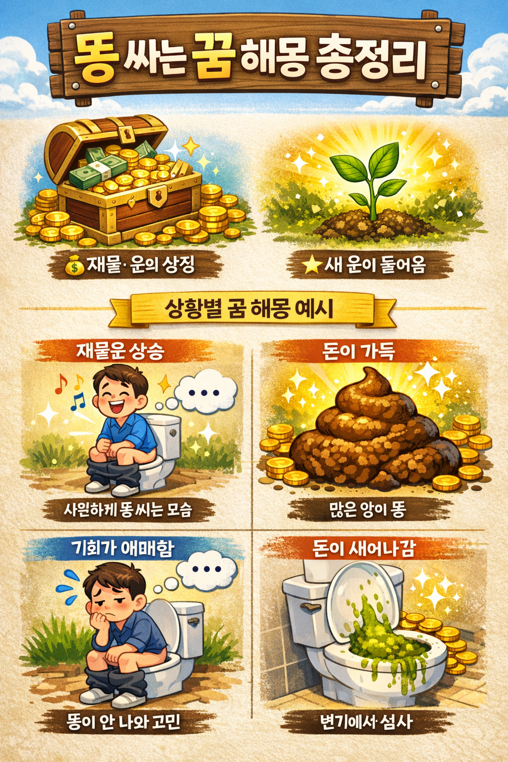 똥 꿈은 재물·돈·운의 흐름과 아주 밀접한 꿈이에요.