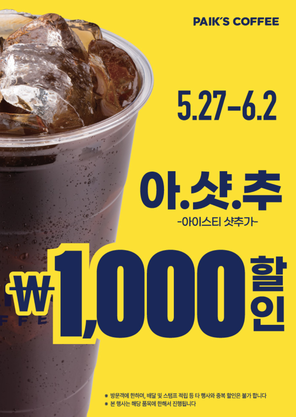 | 5/27(화) ~ 6/2(월) | 아샷추 (아이스티 샷 추가) | ₩1,000 할인 | |