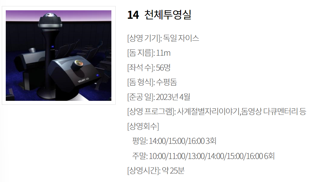 | 천체투영실 | 4계절 별자리 | 지하 1층 제3전시실 내 | ※ 평일: 3회 (13:00,14:00,16:00) ※ 주말: 6회(10:00,11:00,13:00,14:00,15:00,16:00) 좌석수: 56석 휴관: 월요일, 공휴일 |