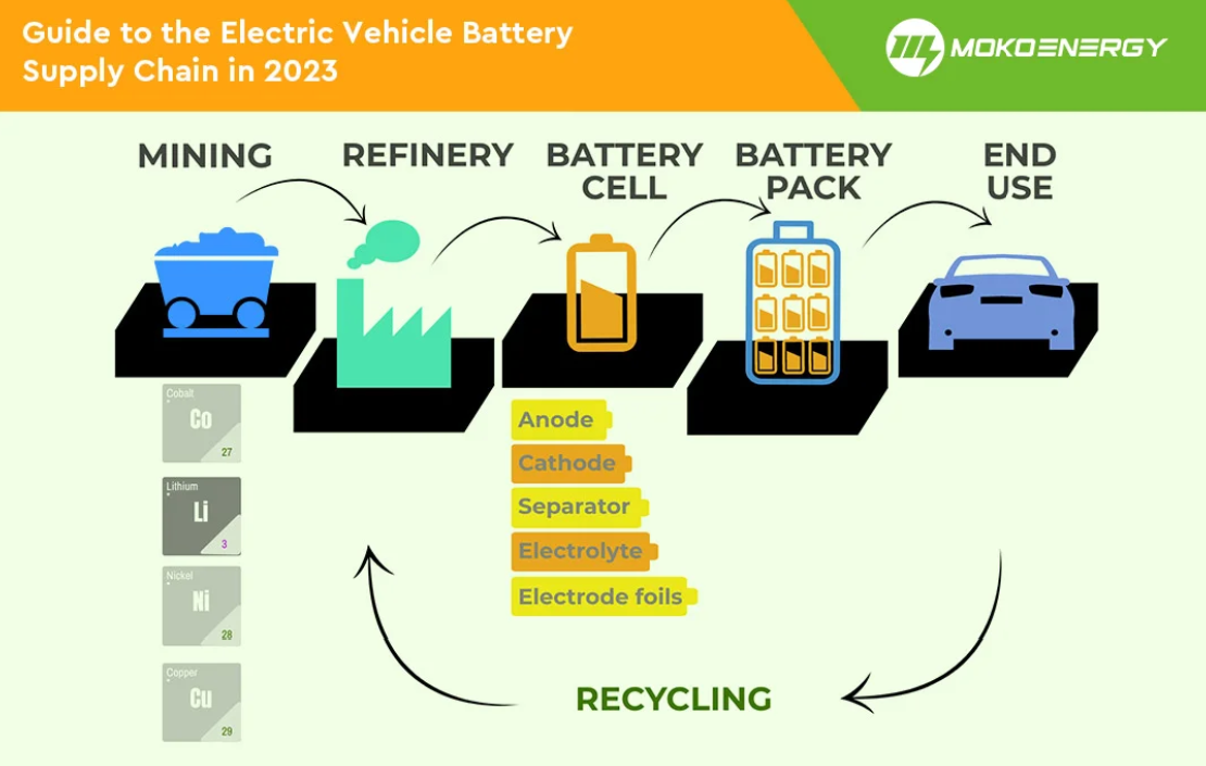 원자재 → 소재 → 셀 → 완성차 장착 → 사용 후 재활용