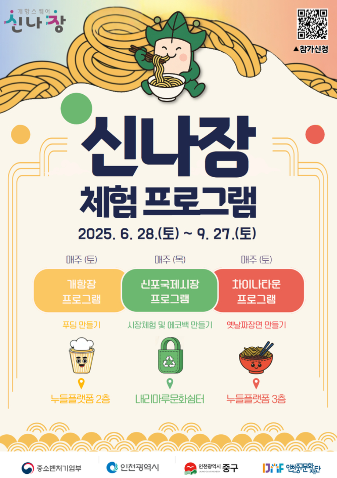 “개항스퀘어 신나장”은 인천 중구의 신포국제시장, 개항장, 차이나타운을 아우르는 3대 관광권역을 통합한 체험형 문화관광 브랜드입니다. 각 지역의 특색을 살린 체험 프로그램들을 하나로 연결하여, 방문객들이 흥미와 참여를 동시에 느낄 수 있는 관광 콘텐츠로 구성되어 있어요.