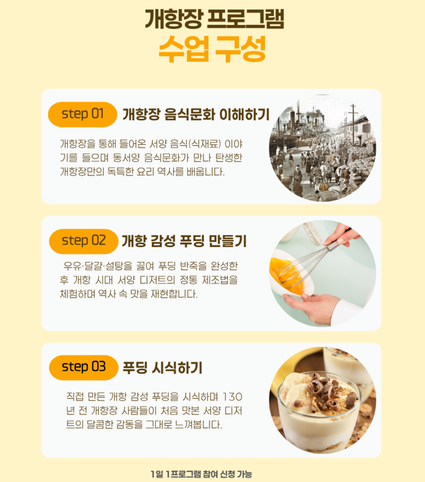 개항장 음식문화 이해 → 푸딩 만들기 실습 → 시식